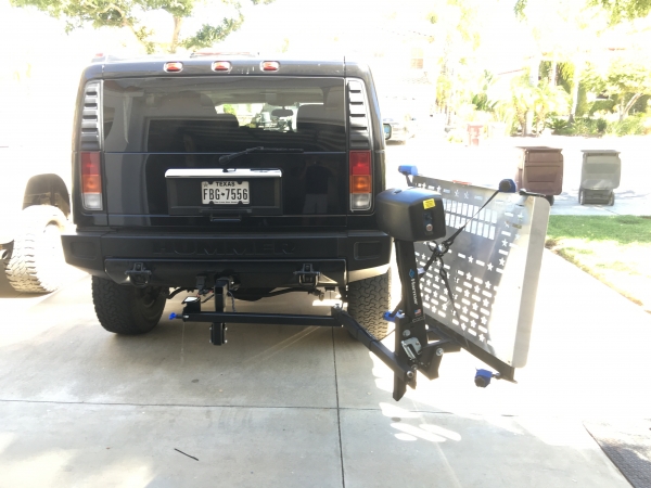 Harmar AL-500 universal powerrchair / scooter lift on a Hummer H2. This has the swing away arm to allow access to the rear door.