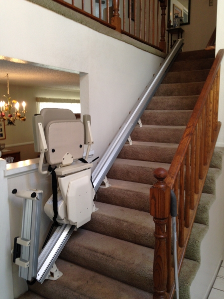 Harmar Pinnacle stair lift with an automatic folding lower rail. This rail folds up with not in use to avoid causing a trip hazard at the bottom of the stairs.